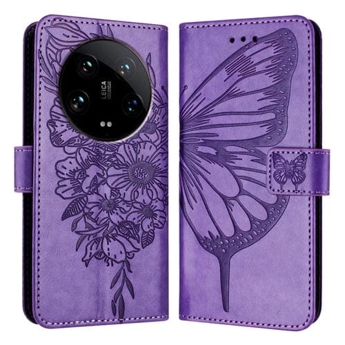 Para Xiaomi 14 Ultra 5G Funda Para Teléfono De Cuero Con Mariposa En Relieve Global (Púrpura)