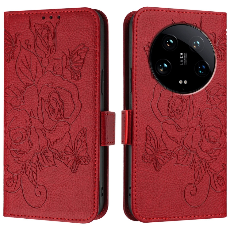 Para Xiaomi 14 Ultra 5G Global Embossed Rose Rfid Funda De Cuero Antirrobo Para Teléfono (Rojo)