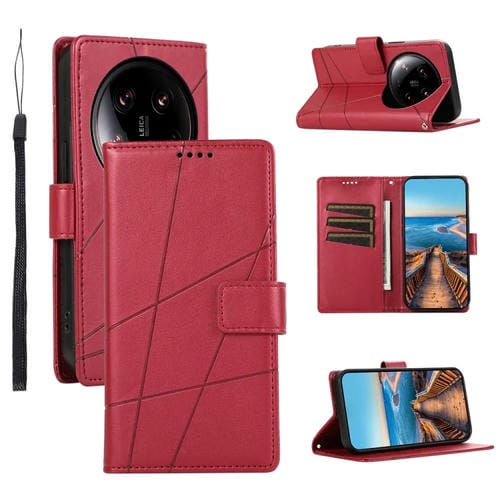 Para Xiaomi 14 Ultra Pu Funda Para Teléfono Con Textura De Cuero Genuino Y Línea En Relieve (Rojo)