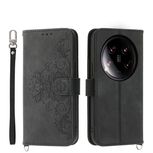 Para Xiaomi 14 Ultra Skin-Feel Flowers Funda De Cuero Para Teléfono Con Billetera En Relieve (Negro)