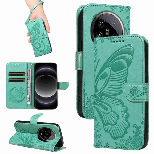 Para Xiaomi 14 Ultra Swallowtail Butterfly Funda De Cuero Para Teléfono En Relieve (Verde)