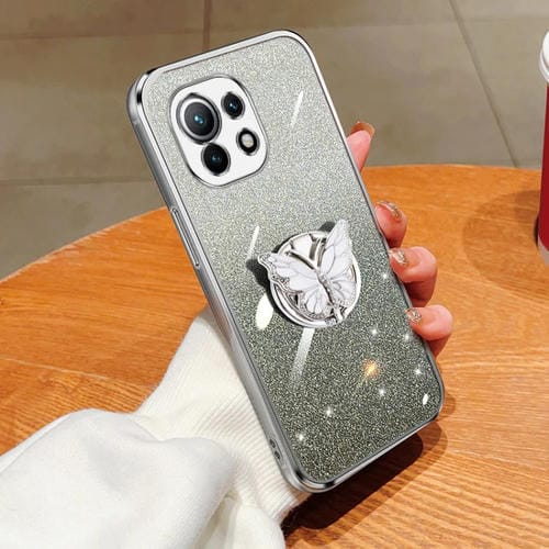 Para Xiaomi Mi 11 Funda para Teléfono de TPU con Soporte de Mariposa con Brillo Degradado Plateado (Plata)
