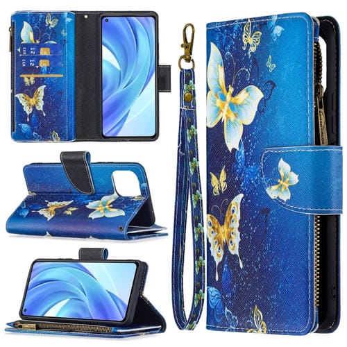 Para Xiaomi Mi 11 Lite Patrón de Dibujo de Color con Cremallera Caja de Cuero con Tirón Horizontal con Soporte y Tragamonedas y Billetera (Mariposa de Oro)