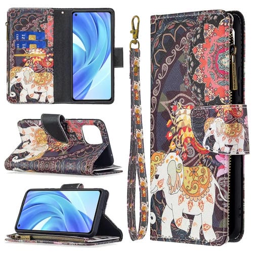 Para Xiaomi Mi 11 Lite Patrón de Dibujo de Color con Cremallera con Cremallera de Cuero Horizontal Flip Funda con Soporte y Tragamonedas y Billetera (Elefantes de Flores)