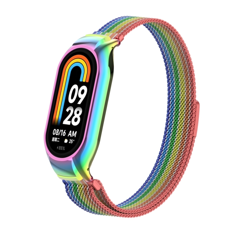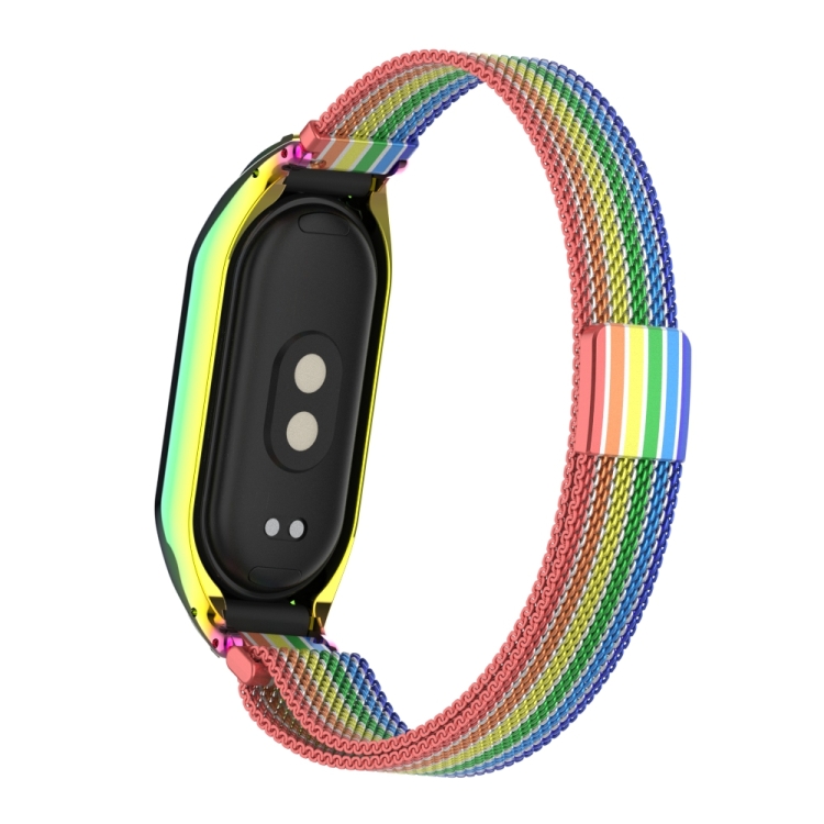 Caja de Metal Integrada para Xiaomi Mi Band 8 + Banda Magnética Milanesa (Barras de Arco Iris)