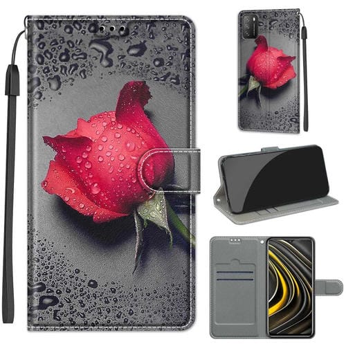 Para Xiaomi Poco M3 Voltaje de Color Dibujo de Color Magnético Cierre de Cuero Horizontal Flip Pu Funda con Soporte y Ranuras para Tarjetas (C14 Black Water Drop Rose)