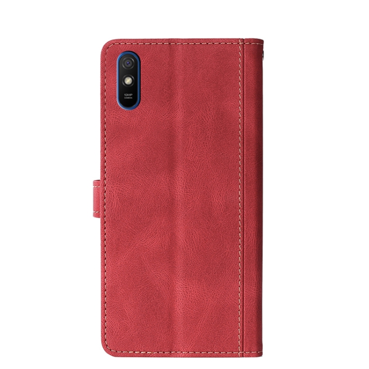 Para Xiaomi Redmi 9A Costuras Siente la Piel con Hebilla Magnética Funda de Cuero Horizontal Flip Pu con Soporte y Ranuras para Tarjetas y Billetera (Rojo)