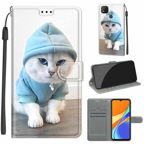 Para Xiaomi Redmi 9C Tensión de Color Dibujo de Color Magnético Cierre de Cuero Horizontal Flip Pu Funda con Soporte y Ranuras para Tarjetas (C15 Suéter Azul Blanco Gato)