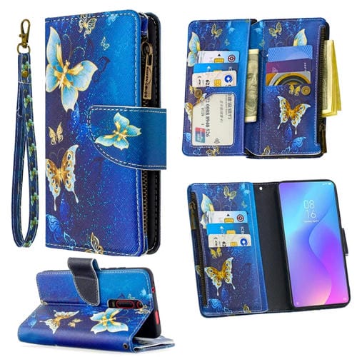Para Xiaomi Redmi K20 / Mi 9T Patrón de Dibujo de Colores Cremallera Funda de Cuero con Tapa Horizontal con Soporte y Ranuras para Tarjetas y Billetera (Mariposa Dorada)