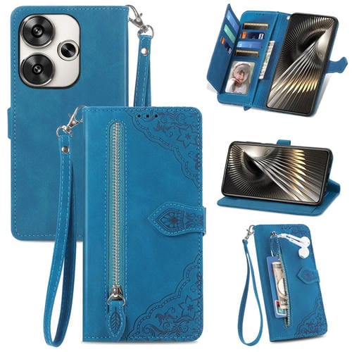 Para Xiaomi Redmi Turbo 3 5G Funda de Cuero con Cremallera y Flores En Relieve (Azul)