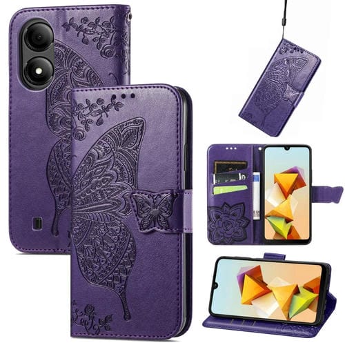 Funda para ZTE Blade A33S de Cuero con Relieve de Flor y Mariposa (Púrpura Oscuro)