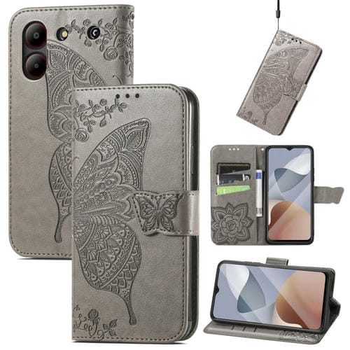Funda para ZTE Blade A54 de Cuero con Relieve de Flor y Mariposa (Gris)