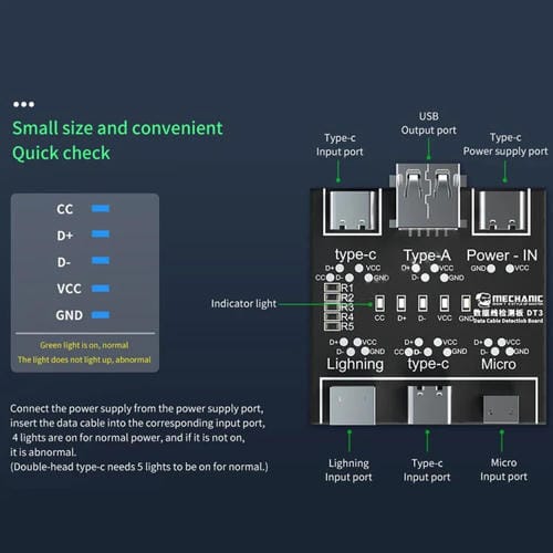 El Probador de Conmutación de Encendido y Apagado para Placa y Detección de Cortocircuito en Cable de Datos USB Mechanic DT3 es una herramienta especializada diseñada para la verificación rápida y precisa del estado funcional de Cables de datos USB en diferentes formatos, incluyendo USB estándar, Tipo-C (dos variantes), Micro USB y Lightning. Este dispositivo permite detectar fallos de Carga y transmisión de datos mediante un sistema de luces indicadoras, facilitando la identificación de problemas en líneas de datos y cortocircuitos en Placas relacionadas. Su diseño compacto y ultraligero, con dimensiones aproximadas de 48,5x45 mm y un peso de 12 gramos, lo hace ideal para técnicos y usuarios que reparan por cuenta propia, mejorando la eficiencia en la detección y diagnóstico de Cables USB y Conectores. Funciona con una Corriente de salida de 1A y un voltaje de 5V, utilizando una interfaz tipo C para la fuente de Alimentación.