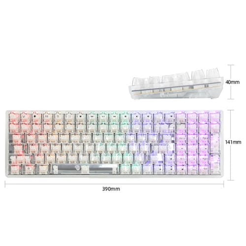 - Diseño de 100 teclas con tecla transparente, interruptores mecánicos de eje verde, iluminación RGB con 18 efectos y 8 colores, Cable USB-C de 1,5 metros, tamaño 390x141x40 mm, peso 1 kg, teclas intercambiables en caliente, plug and play sin controlador