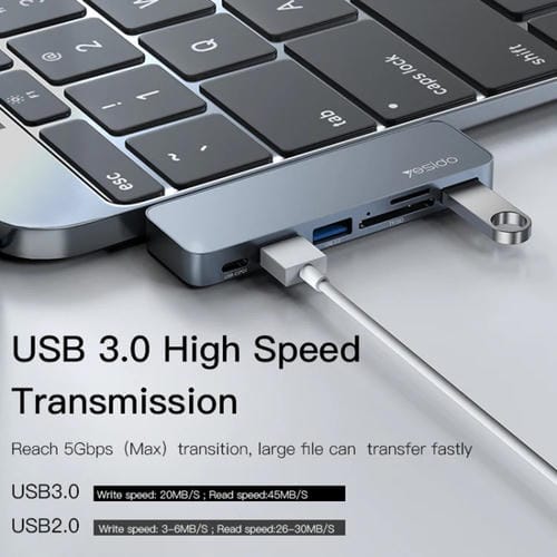 La estación de acoplamiento Yesido HB10 es un adaptador hub multifuncional con 6 Puertos USB-C / Type-C diseñado para ampliar la conectividad de dispositivos compatibles con USB-C, como Portátiles, Tablets y Smartphones. Fabricada en aleación de zinc y aluminio, combina durabilidad con un diseño compacto de 95x30mm y un peso ligero de 37 gramos, facilitando su transporte y uso en cualquier entorno. Su función Principal es ofrecer una solución integral para la Conexión de múltiples dispositivos y Accesorios, incluyendo Tarjetas TF/SD, Puertos USB 3.0 y USB 2.0, además de Soporte para Carga rápida PD con una Potencia entre 60W y 96W. La estación permite transferencias de datos de alta velocidad hasta 5 Gbps, ideal para usuarios que requieren acceso rápido a archivos multimedia y datos pesados, como fotógrafos y diseñadores.