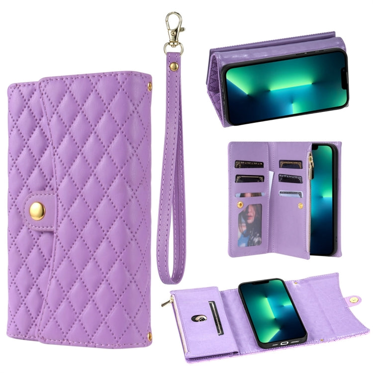 Funda para Teléfono iPhone 13 Pro Cuero Rómbico con Billetera MultiTarjeta y Cremallera (Púrpura)