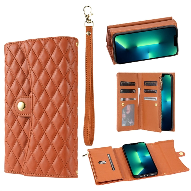 Funda para Teléfono iPhone 13 Pro Cuero Rómbico con Billetera MultiTarjeta y Cremallera (Marrón)