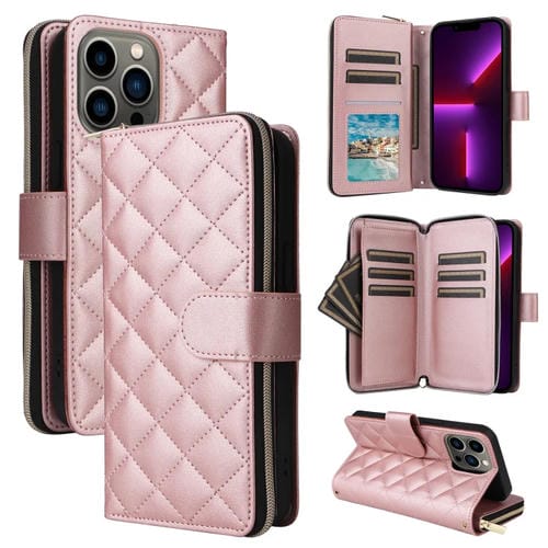 Funda para Teléfono iPhone 13 Pro Cuero Hebilla Torre Cremallera Rombal Cruzada con Cordón (Beige)