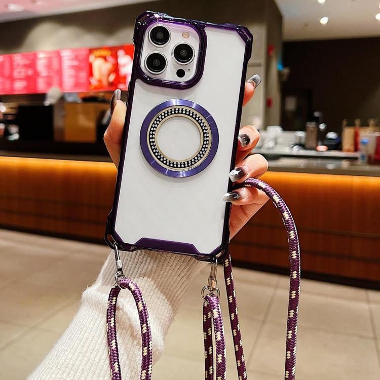 Funda para Teléfono TPU iPhone 16 Pro Max Traveler Crossbody con Cuatro Esquinas y Cordón (Morado)