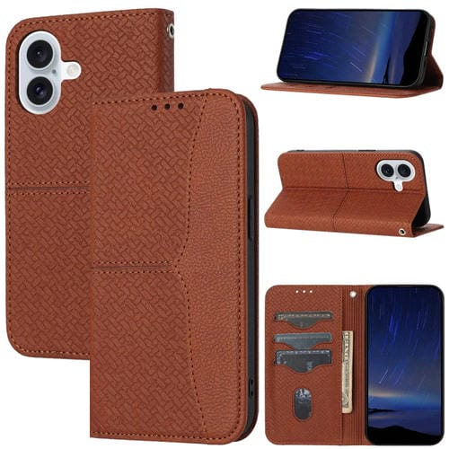 Funda de Teléfono iPhone 16 Cuero Magnético con Costura Textura Tejida (Marrón)