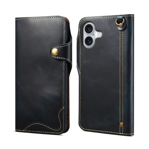Funda de Piel de Vaca Denior B01 con Botón Magnético y Cera de Aceite para iPhone 16 Plus (Azul)