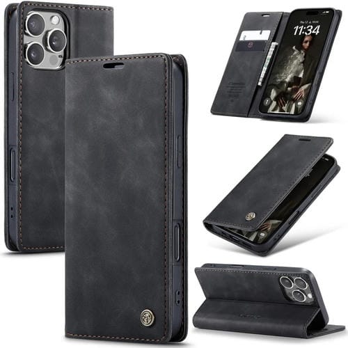 Funda de Cuero Caseme 013 con Tapa Horizontal Multifuncional para iPhone 16 Pro (Negra)