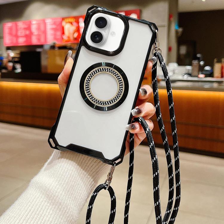 Funda para iPhone 16 Traveler Crossbody Lanyard Magsafe de Cuatro Esquinas TPU (Negra)