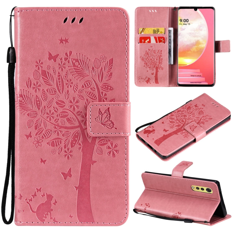 Funda de Cuero PU con Soporte y Tarjetero para LG Velvet 2 Pro (Oro Rosa) con Patrón Árbol y Gato