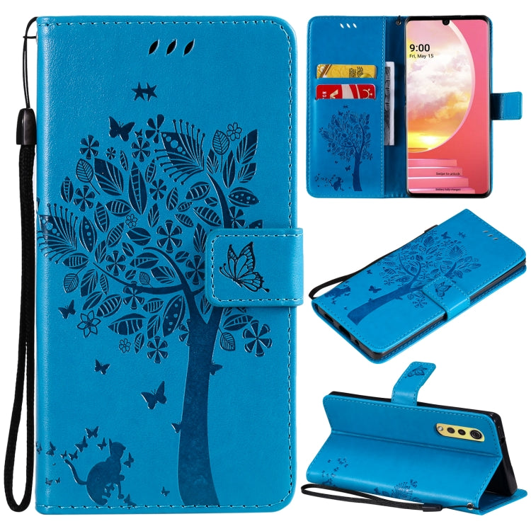 Funda de Cuero PU con Soporte, Tarjetero y Cordón para LG Velvet 2 Pro (Azul) con Patrón Árbol y Gato