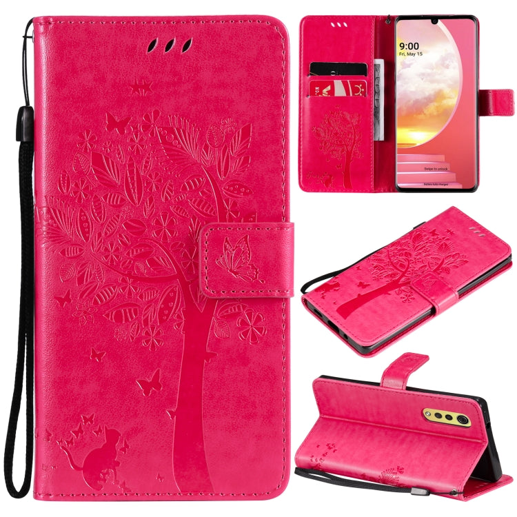 Funda de Cuero PU con Soporte, Tarjetero y Cordón para LG Velvet 2 Pro (Rojo) con Patrón Árbol y Gato