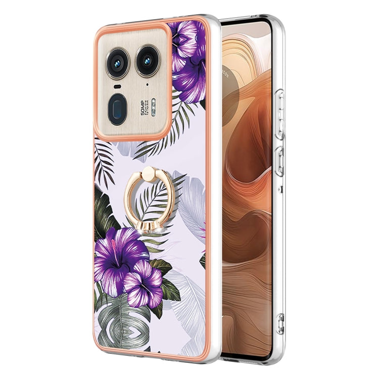 Funda TPU con Patrón Galvanoplastia y Soporte Anillo para Motorola Moto G85 (Flor Morada)