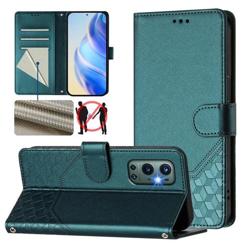 Funda de Cuero Rfid con Relieve en Panal para OnePlus 9 Pro (Verde Pavo Real)