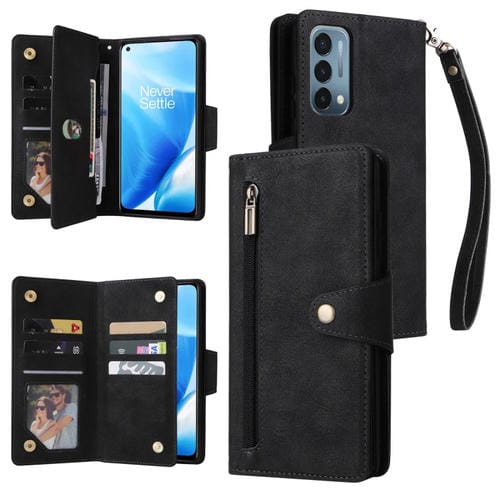 Funda de Cuero con Tres Pliegues y Hebilla para OnePlus Nord 200 5G, 9 Tarjetas (Negro)