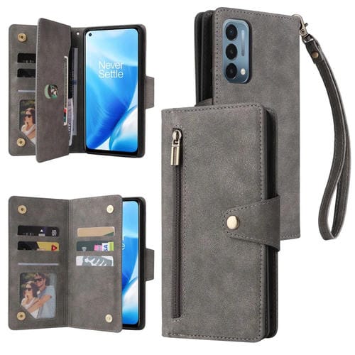 Funda de Cuero para OnePlus Nord 200 5G con Tres Pliegues y Hebilla, 9 Tarjetas (Gris)