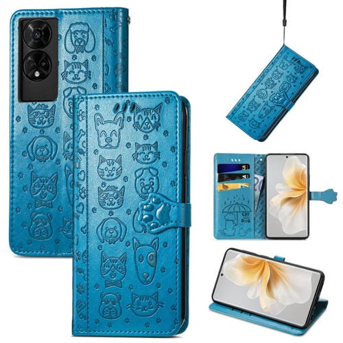 Funda de Piel con Relieve de Gato y Perro para Teléfono TCL 50 5G (Azul)
