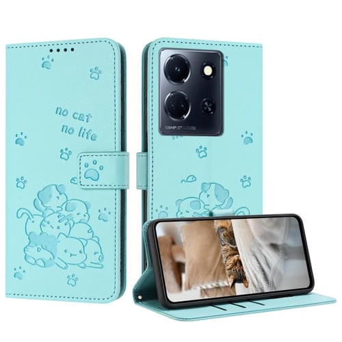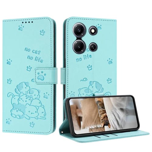 Funda de Cuero con Relieve de Gatito para Infinix Hot 30 Play Nfc con Cordón (Verde Menta)