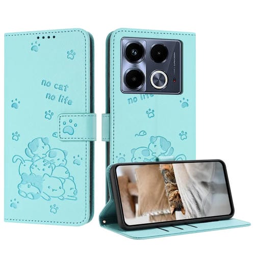 Funda de Cuero Infinix Note 40 5G con Diseño de Gatito En Relieve y Cordón (Verde Menta)