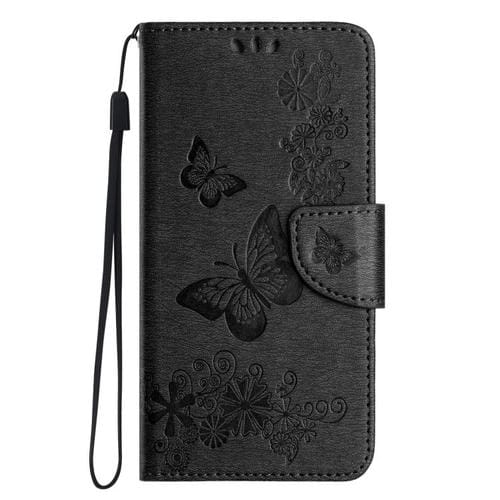 Funda de cuero con tapa y diseño de mariposas y flores para iPhone 17 (negra)