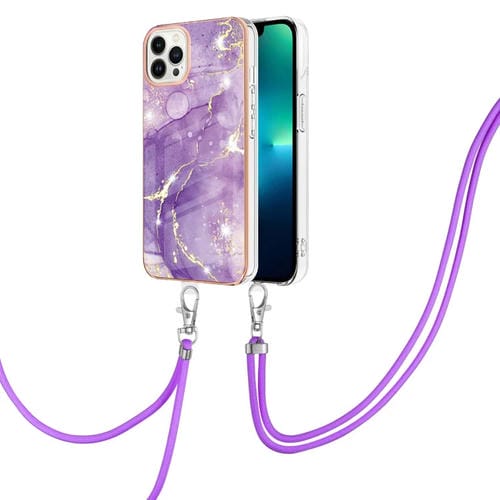 Estuche para iPhone 15 Pro Galvanoplastia Mármol Imd TPU a Prueba de Golpes con Cordón (Púrpura)