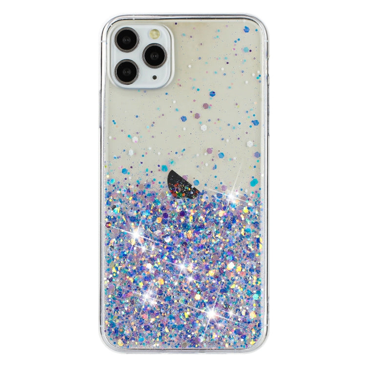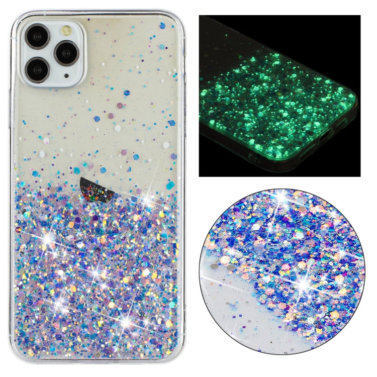 Caja teléfono TPU iPhone 11 Pro Max con Polvo brillo Noctilucente marco Transparente (Púrpura)