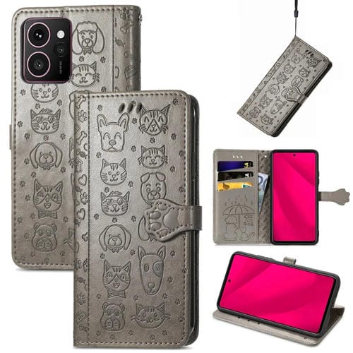 Funda de Cuero para Teléfono HMD Skyline con Relieve de Gato y Perro (Gris)