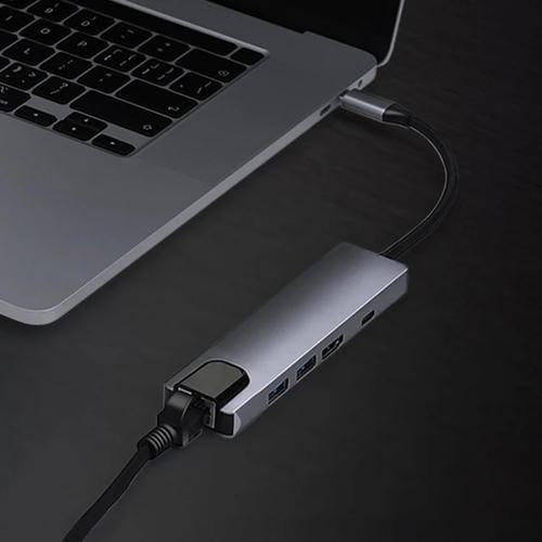 - 1x Adaptador Hub USB Tipo-C 5 en 1 con RJ45, USB 3.0 x2, PD y HDMI