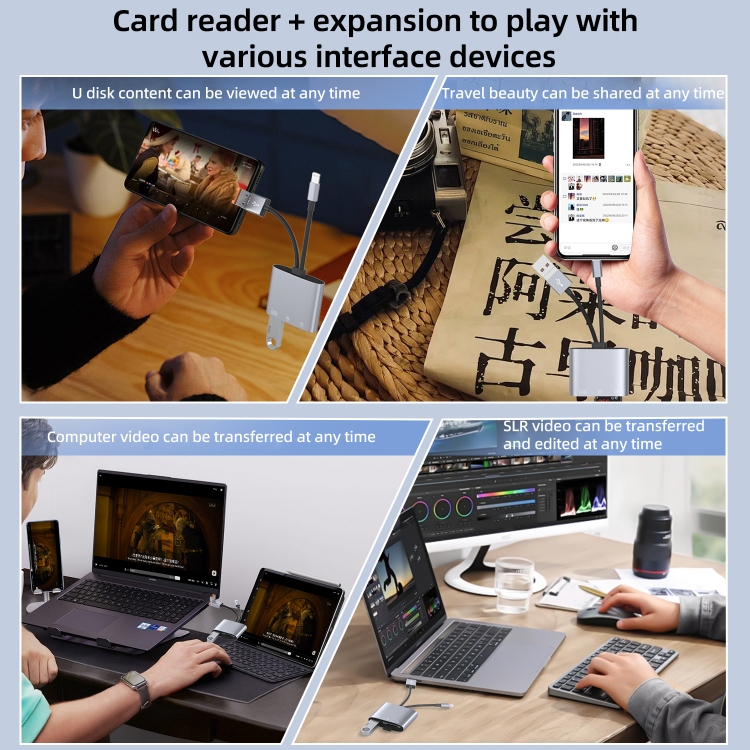El adaptador multifunción 3 en 1 tipo C/USB-A/USB-C es un lector de tarjetas adecuado para diferentes escenarios.Usando el puerto USB principal del adaptador, la ranura para tarjeta SD/TF puede transferir datos para tres dispositivos con diferentes interfaces.