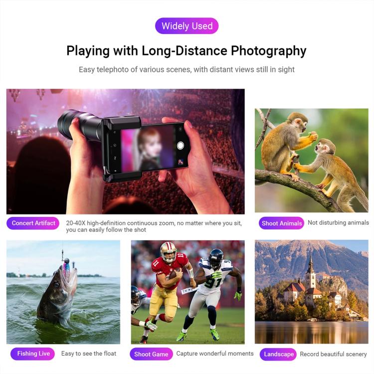 1. Kit de teleobjetivo para teléfono móvil de 20-40x (incluye trípode), solución para disparos a larga distancia con teléfono móvil, sistema óptico de prisma Schmidt integrado y estructura totalmente metálica, ideal para capturar imágenes de alta definición, como la observación de estrellas en conciertos, la observación de aves al aire libre y la observación de la luna en astronomía.