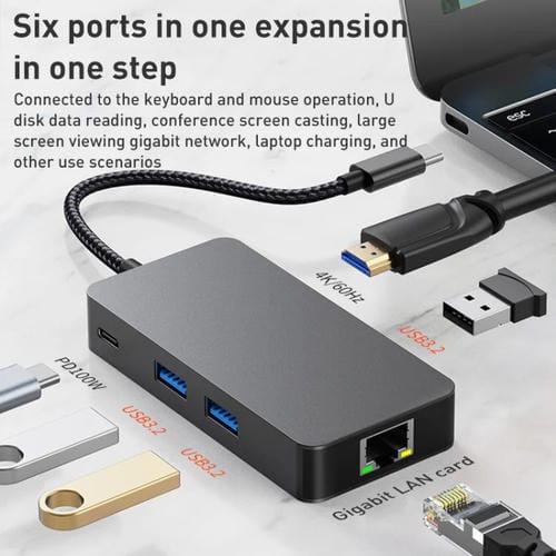 - 1x Adaptador Hub Byl-2308 6 en 1 USB-C a USB 3.2, Internet Gigabit y HDTV (Gris Oscuro)