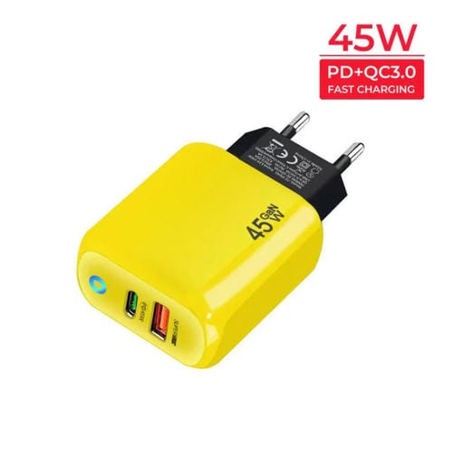 Cargador TE-PD45 GaN 45 W PD3.0/Tipo C + USB 3.0 con cable de datos tipo C a tipo C, enchufe UE (amarillo)