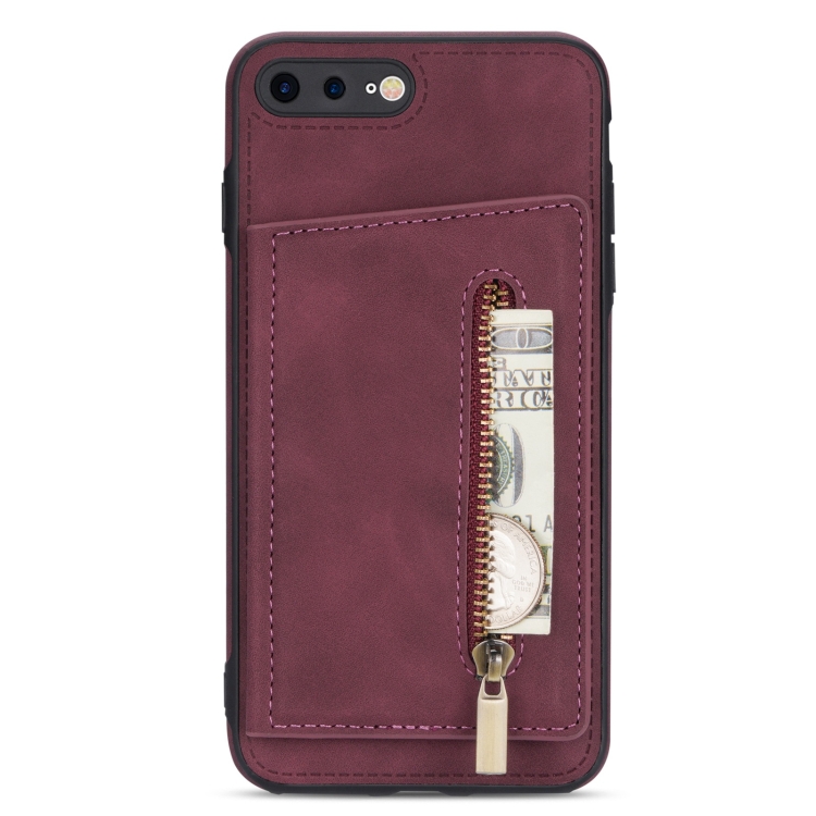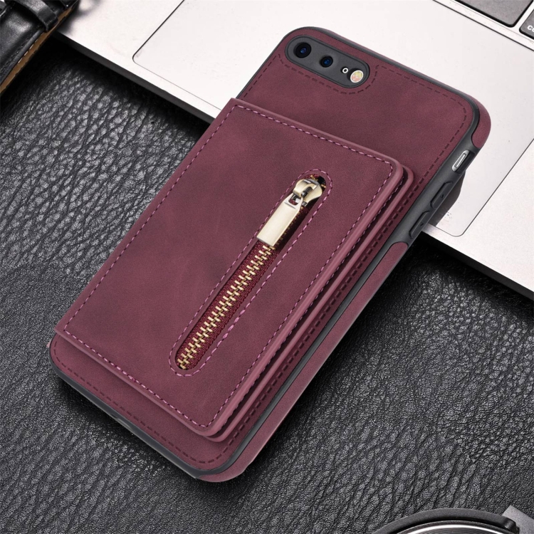 Case de Teléfono Soporte de Tarjeta Cremallera para iPhone 8 Plus / 7 Plus (Vino Rojo)