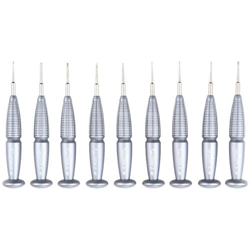Incluye nueve destornilladores de precisión con tamaños Y0.6, Y0.8, 1.2, T2, T5, T8, 1.2, 2.5 y 1.5, todos con puntas magnéticas. -