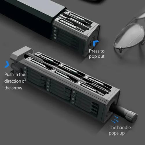 El Juego de destornilladores de precisión 44 en 1 es una herramienta diseñada para el desmontaje y reparación de ordenadores y Teléfonos Móviles, así como otros dispositivos electrónicos de precisión. Este set profesional incluye una amplia variedad de puntas intercambiables fabricadas en acero para herramientas de aleación S2, con tratamiento de superficie gris fosfatado para mayor durabilidad y resistencia al desgaste. El mango está elaborado en aleación de aluminio, ofreciendo un agarre cómodo y seguro, con un diseño tipo empuje que facilita su uso. Además, cuenta con ranura magnética para una adsorción efectiva de las cabezas, evitando caídas accidentales durante el trabajo. Este kit es compatible con múltiples dispositivos electrónicos y es ideal para usuarios que reparan por cuenta propia, técnicos y profesionales del sector.