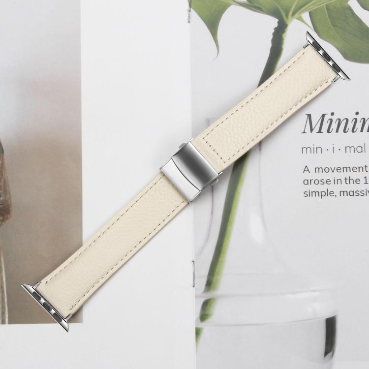 Correa de cuero con hebilla trasera de tortuga plateada y textura de lichi para Apple Watch de 42 mm, 41 mm, 40 mm y 38 mm (blanco cremoso)